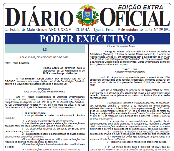 📄 Fonte: Diário Oficial do Estado de Mato Grosso – Lei nº 13.087, de 9 de outubro de 2025 (LDO 2026)